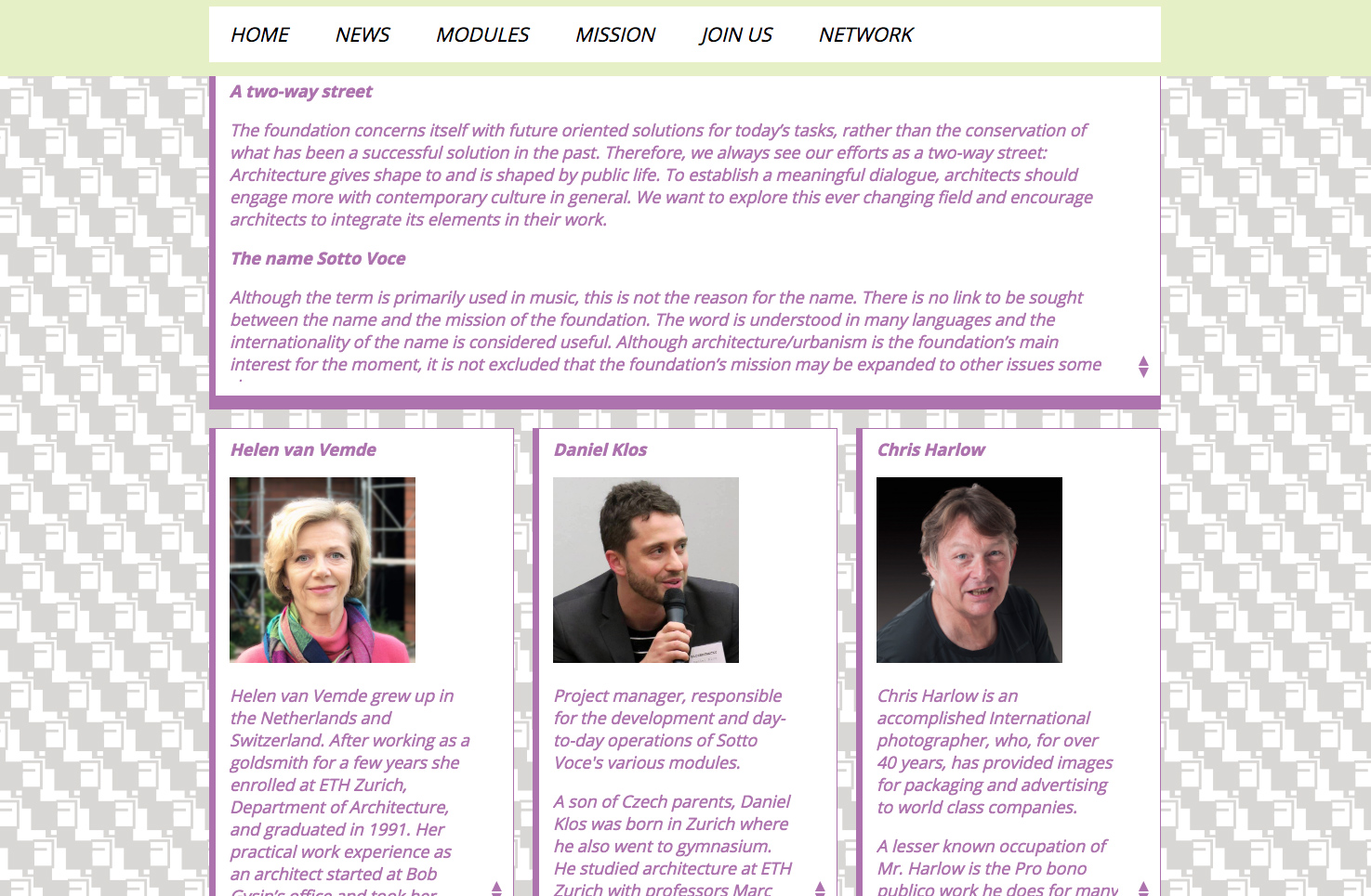 Für die Fondation Sotto Voce wurde in Zusammenarbeit mit dem Angela Kaufmann Design Studio eine neue Webseite realisiert. Das innovative und aussergewöhnliche Design von Angela Kaufmann bringt den Charakter der Fondation Sotto Voce auf den Punkt. Mit dem Open Source CMS Drupal umgesetzt, wird die Webseite autonom vom Kunden gepflegt und ausgebaut. Schon nach einer kurzen Schulung wurde die Verwaltung des Inhalts komplett von Sotto Voce übernommen. Wir wünschen der Fondation Sotto Voce viel Vergnügen mit der neuen Webseite!